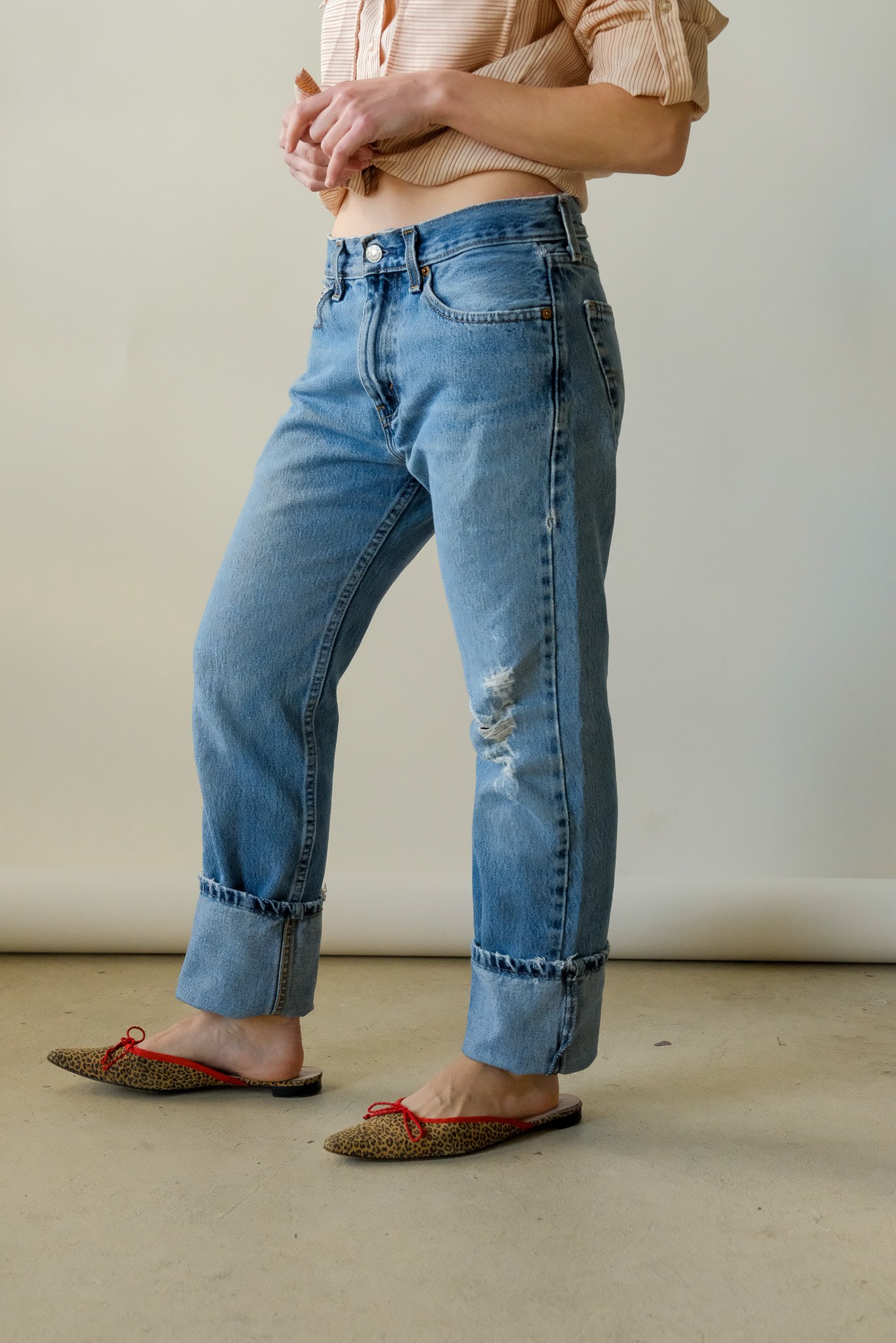 Mid rise, straight leg fit Levi 505’s. Distressed through the leg, good for modern sizes 4-6